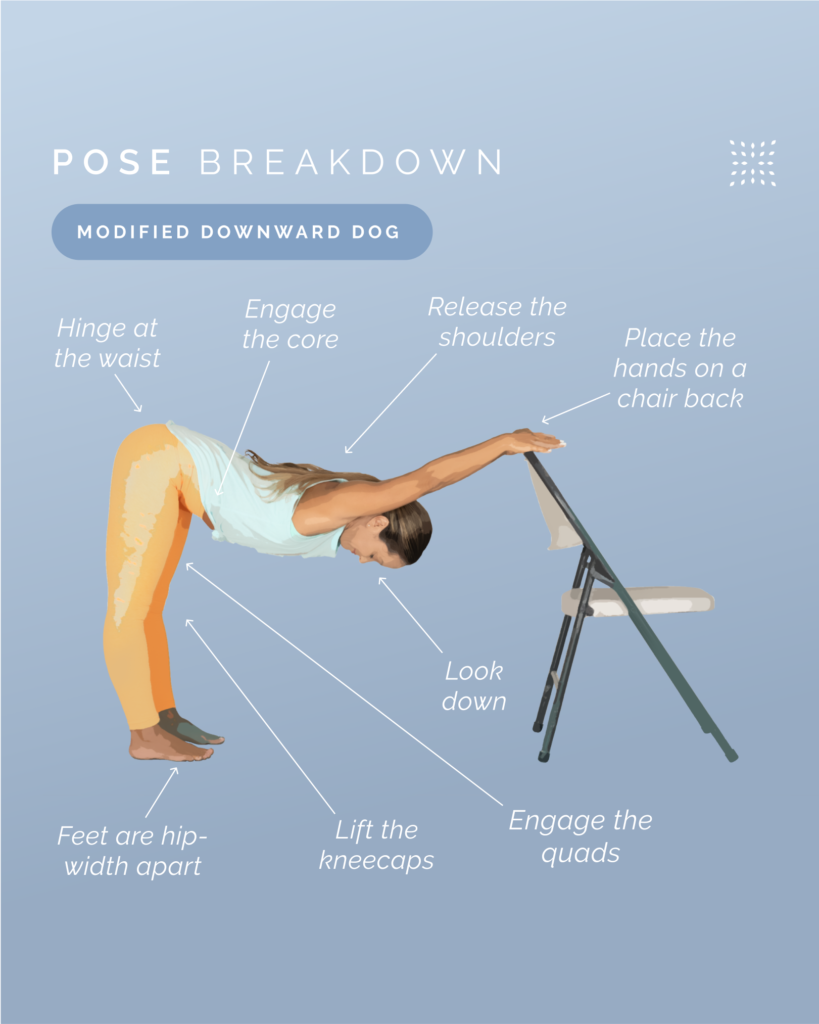 Take a shorter stance than in a traditional Warrior II to keep strain low. Turn your right toes out, bend your right knee slightly, and keep your left leg straight. Rest one hand on a chair or wall.