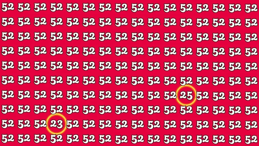 “23” and “25.” These numbers are placed among dozens of “52” digits, making them harder to notice at first glance. The “23” appears toward the bottom-left area, while the “25” is located more toward the middle-right side of the image, both highlighted with yellow circles.
